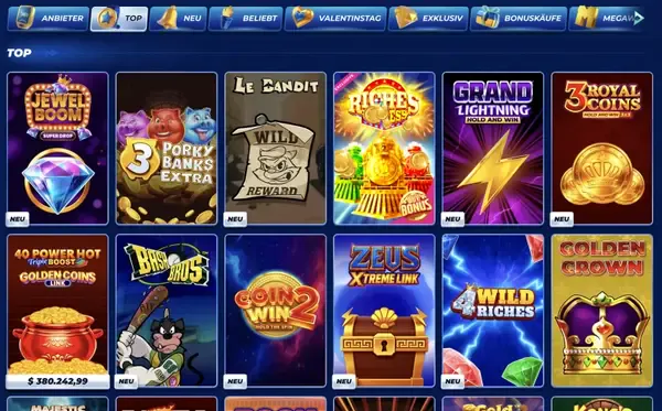 Wir bieten mehr als 9.000 Titel in den wichtigsten Kategorien, mit Inhalten von Pragmatic Play, Evolution, Microgaming, Play'n GO, Relax Gaming, Hacksaw Gaming, Elk Studios, Push Gaming, Red Tiger und Betsoft. Du findest Slots, Tischspiele, Live-Casino-Räume, Jackpots, Megaways und Bonus-Buy-Optionen. Wenn du nach Bassbet Spielautomaten suchst, kannst du nach Mechaniken wie Megaways oder nach Features wie Bonus Buy filtern, um Ergebnisse schneller einzugrenzen.